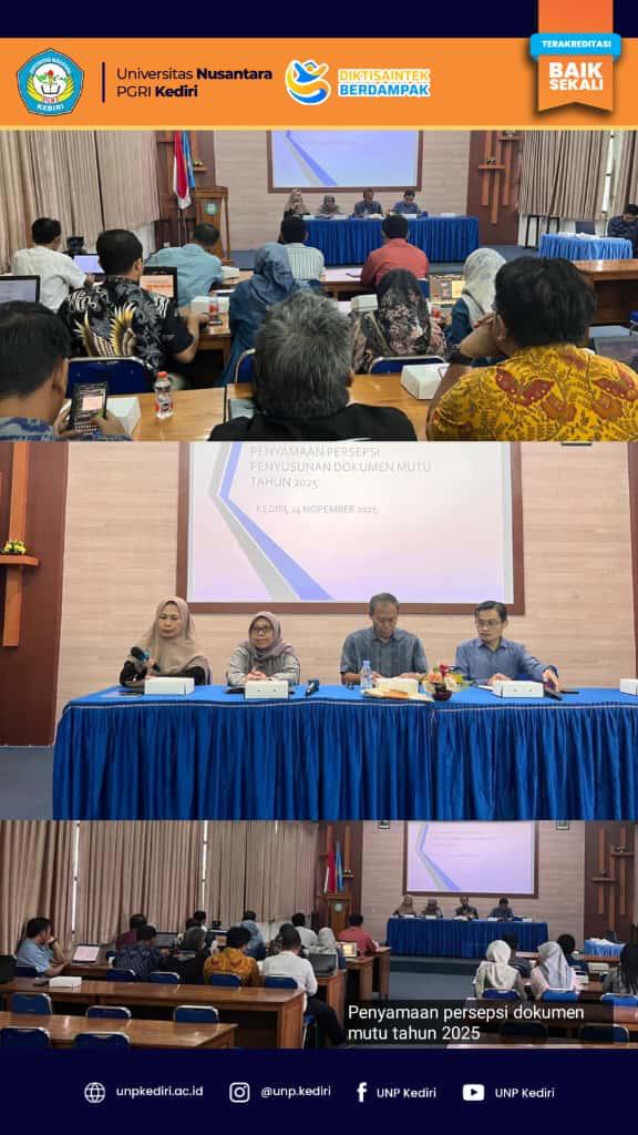 Puji syukur kita panjatkan ke hadirat Tuhan Yang Maha Esa, karena atas rahmat dan karunia-Nya kita dapat melaksanakan kegiatan Penyusunan Dokumen Mutu Universitas Nusantara PGRI Kediri. Kegiatan ini merupakan langkah strategis dalam memperkuat sistem penjaminan mutu internal sebagai fondasi peningkatan kualitas tata kelola, akademik, dan layanan universitas.